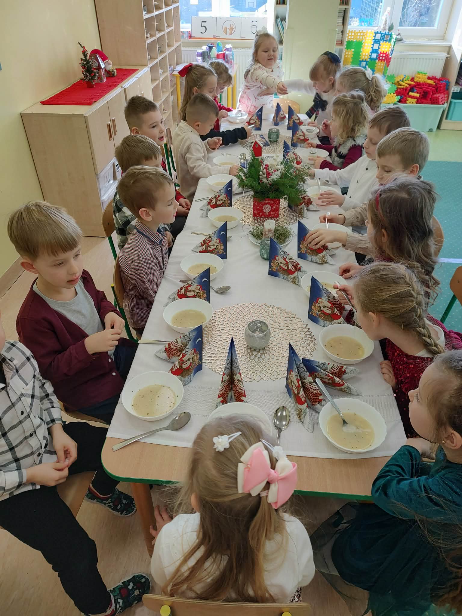 W naszym przedszkolu odbyła się wyjątkowa wigilia, pełna ciepła, radości i świątecznej atmosfery. Dzieci, ubrane odświętnie, z wielkim zaangażowaniem uczestniczyły w tym szczególnym dniu. Wspólnie dzieliliśmy się opłatkiem, składając sobie serdeczne życzenia, ucząc się przy tym życzliwości, empatii i tradycji bożonarodzeniowych. Przy pięknie udekorowanych stołach dzieci zasiadły do świątecznego obiadu, na który składał się aromatyczny barszcz oraz pyszne pierogi. Na deser nie zabrakło piernika świątecznego, który sprawił wszystkim wiele radości. Podczas wigilii rozbrzmiewały kolędy i świąteczne piosenki, które wprowadziły wszystkich w wyjątkowy, bożonarodzeniowy nastrój. W całym przedszkolu panowała atmosfera bliskości, radości i wspólnego przeżywania tego pięknego czasu. Był to dzień pełen wzruszeń i niezapomnianych chwil, który na długo pozostanie w naszej pamięci.
