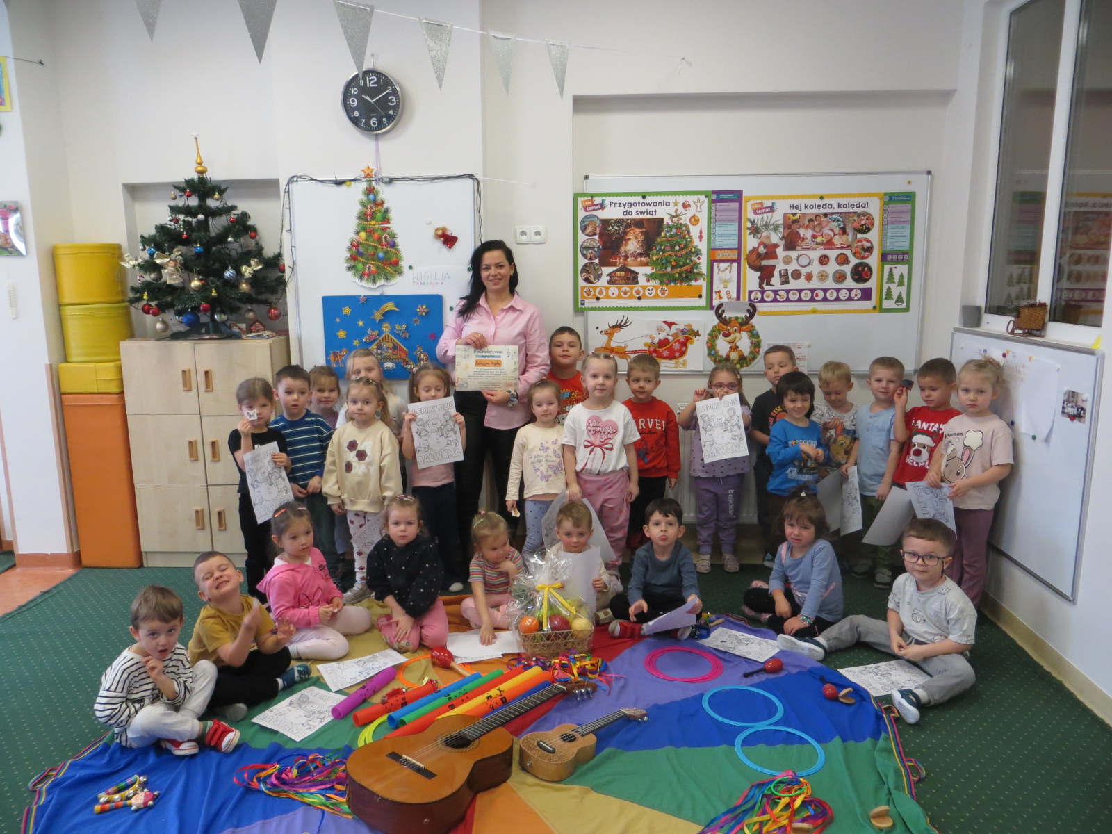 Było to niezwykle radosne i inspirujące spotkanie, podczas którego dzieci mogły zanurzyć się w świecie muzyki. Pani Kasia zaprezentowała przedszkolakom różnorodne instrumenty muzyczne, takie jak gitara, ukulele, boom boom rurki, marakasy oraz wiele innych. Dzieci nie tylko mogły je zobaczyć i usłyszeć, ale również spróbować na nich zagrać, co sprawiło im ogromną frajdę i pozwoliło rozwijać wrażliwość muzyczną. Podczas zajęć wspólnie zaśpiewaliśmy kolędy: "Skrzypi wóz ” oraz "Przybieżeli do Betlejem Pasterze”, tworząc ciepłą, świąteczną atmosferę pełną uśmiechu i pozytywnej energii. Zajęcia odbyły się w ramach realizowanego w przedszkolu programu zdrowotnego „W codziennej zabawie i rozmowie uczymy się jak dbać o zdrowie”, w którym zwracamy uwagę m.in. na wpływ muzyki na dobry nastrój, poprawę humoru oraz jej rolę jako sposobu na rozładowanie trudnych emocji i stresu. Dzieci mogły doświadczyć, jak muzyka pomaga się wyciszyć, ale też daje radość i energię.