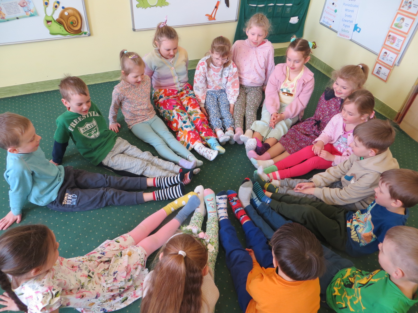 21 marca, to również Światowy Dzień Zespołu Downa. W tym dniu, w ramach akcji społecznej Dzień Kolorowej Skarpetki, okazaliśmy naszą solidarność, akceptację i zrozumienie dla osób z Zespołem Downa. Poprzez włożenie dwóch, kolorowych skarpetek daliśmy czytelny znak naszego zainteresowania i aprobaty. Dzieci wysłuchały również pogadanki poprowadzanej przez Pedagoga przedszkolnego panią Barbarę Wilgę. Dzisiejszy dzień, w naszym przedszkolu przebiegał w radosnej, barwnej i aktywnej atmosferze.