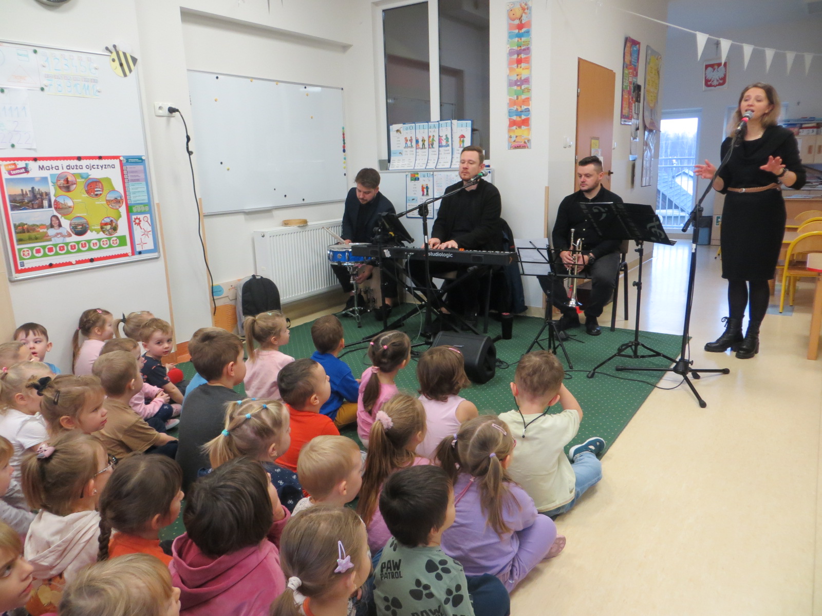 Muzycy Filharmonii Podkarpackiej odwiedzili naszą placówkę w poniedziałek, 17 listopada z audycja muzyczną pt. "Z ziemi włoskiej do Polski- czyli o polskim hymnie narodowym". Niełatwy dla przedszkolaków obszar wychowania patriotycznego, dotyczący między innymi historii, znaczenia i rozumienia tekstu, tej najważniejszej dla wszystkich Polaków pieśni, wymaga wielokrotnego powtarzania i utrwalania. Stąd dobrze, że po niedawno obchodzonej uroczystości Narodowego Święta Niepodległości jeszcze raz przypomniano "Mazurek Dąbrowskiego", symbole narodowe, pieśń "Co to jest Niepodległość ?" i "Legiony". Dzieci wykazały się ich znajomością, towarzysząc wykonaniu, a goście pomogli im interpretować znaczenie poszczególnych zwrotek. Hymn wykonywany jest od 200 lat przy wszystkich najważniejszych uroczystościach, takich jak państwowe apele i obchody świąt, rocznice patriotyczne czy największe wydarzenia sportowe i warto by każdy Polak rozumiał jego treść.